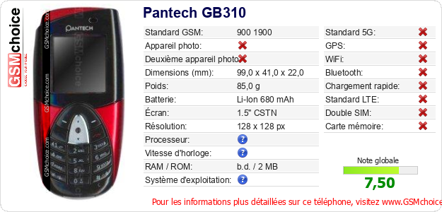 Publier les caractéristiques de ce mobile Pantech GB310 sur votre site