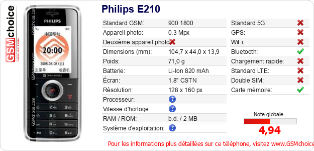 Publier les caractéristiques de ce mobile Philips E210 sur votre site