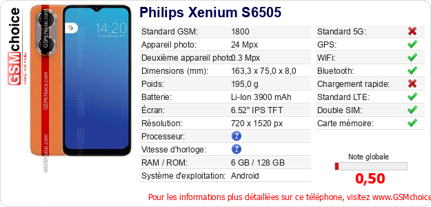 Publier les caractéristiques de ce mobile Philips Xenium S6505 sur votre site