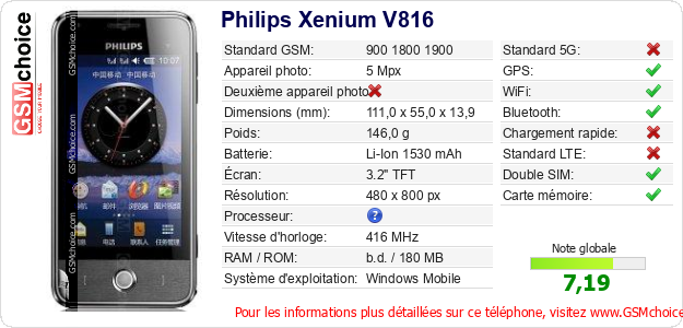 Publier les caractéristiques de ce mobile Philips Xenium V816 sur votre site