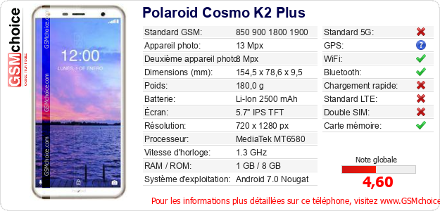 Publier les caractéristiques de ce mobile Polaroid Cosmo K2 Plus sur votre site