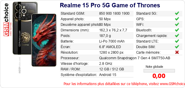 Publier les caractéristiques de ce mobile Realme 15 Pro 5G Game of Thrones sur votre site