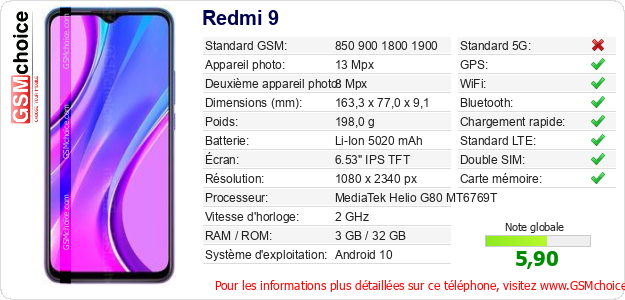 Publier les caractéristiques de ce mobile Redmi 9 sur votre site