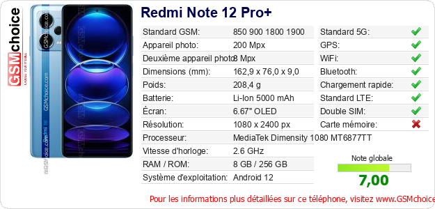 Publier les caractéristiques de ce mobile Redmi Note 12 Pro+ sur votre site
