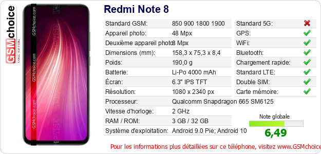 Vous vendez sur eBay ? Vous voulez publier la photo et les caractéristiques de ce Redmi Note 8 sur votre site Internet ? C'est très simple ! Il suffit de copier ce code HTML et de le coller dans le code source de votre site:Ce code provoque l'affichage de l'image suivant: