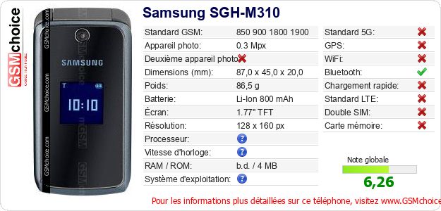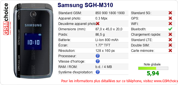 Publier les caractéristiques de ce mobile Samsung SGH-M310 sur votre site