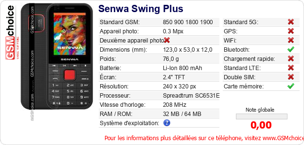 Publier les caractéristiques de ce mobile Senwa Swing Plus sur votre site