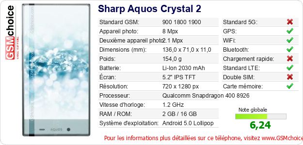 Publier les caractéristiques de ce mobile Sharp Aquos Crystal 2 sur votre site