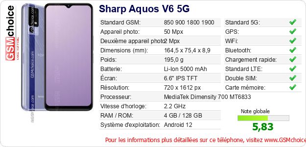 Publier les caractéristiques de ce mobile Sharp Aquos V6 5G sur votre site