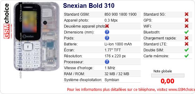 Publier les caractéristiques de ce mobile Snexian Bold 310 sur votre site