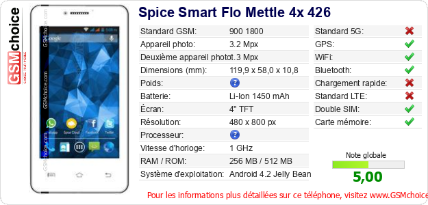 Publier les caractéristiques de ce mobile Spice Smart Flo Mettle 4x 426 sur votre site