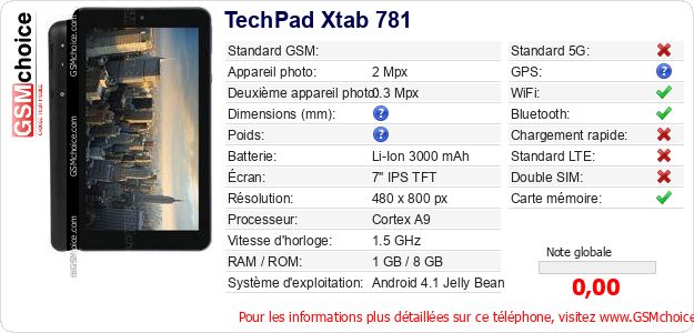 Publier les caractéristiques de ce mobile TechPad Xtab 781 sur votre site