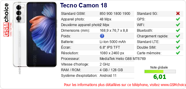 Vous vendez sur eBay ? Vous voulez publier la photo et les caractéristiques de ce Tecno Camon 18 sur votre site Internet ? C'est très simple ! Il suffit de copier ce code HTML et de le coller dans le code source de votre site:Ce code provoque l'affichage de l'image suivant:
