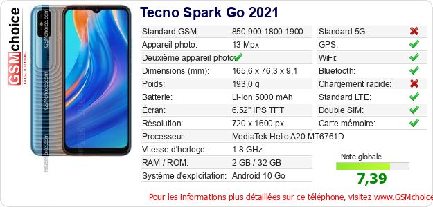 Publier les caractéristiques de ce mobile Tecno Spark Go 2021 sur votre site