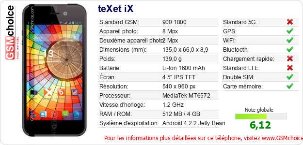 Publier les caractéristiques de ce mobile teXet iX sur votre site