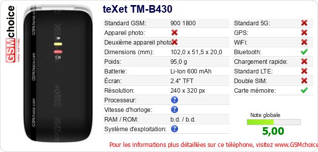 Publier les caractéristiques de ce mobile teXet TM-B430 sur votre site