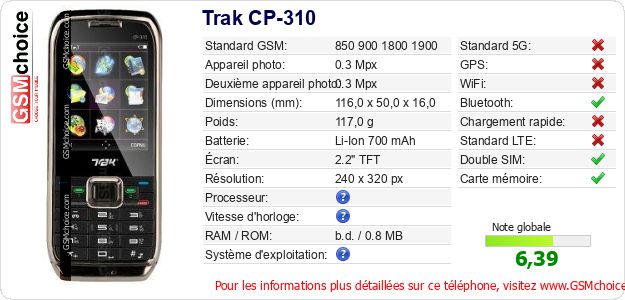 Publier les caractéristiques de ce mobile Trak CP-310 sur votre site