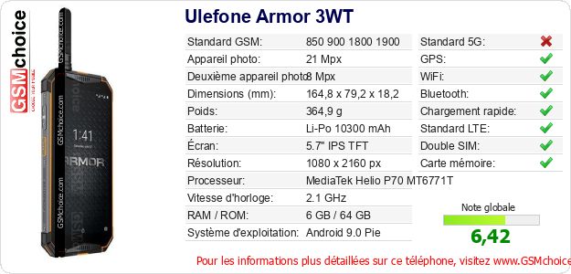 Publier les caractéristiques de ce mobile Ulefone Armor 3WT sur votre site