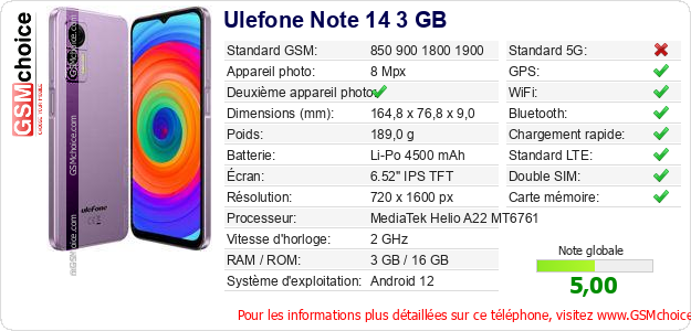 Publier les caractéristiques de ce mobile Ulefone Note 14 3 GB sur votre site