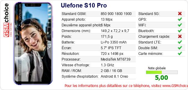 Publier les caractéristiques de ce mobile Ulefone S10 Pro sur votre site