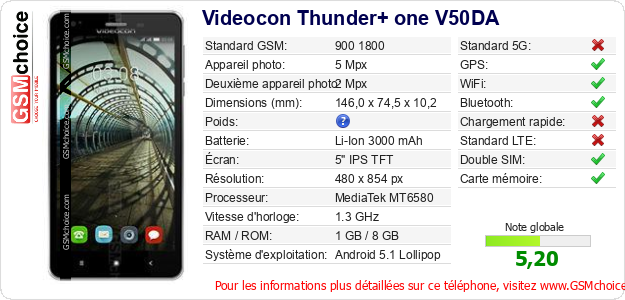 Publier les caractéristiques de ce mobile Videocon Thunder+ one V50DA sur votre site