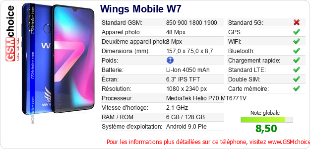 Publier les caractéristiques de ce mobile Wings Mobile W7 sur votre site