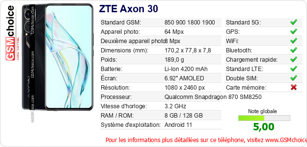 Publier les caractéristiques de ce mobile ZTE Axon 30 sur votre site