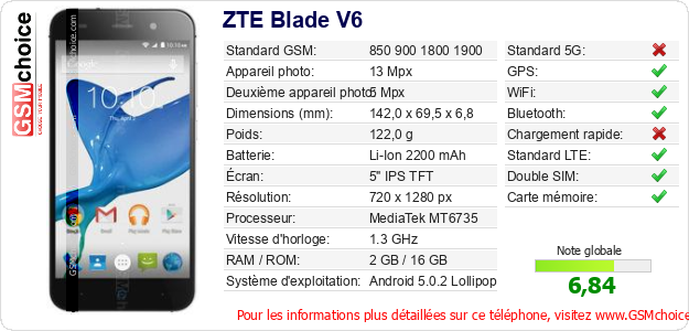 Publier les caractéristiques de ce mobile ZTE Blade V6 sur votre site