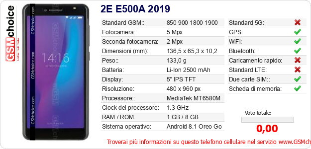 Dati del telefono cellulare 2E E500A 2019 sul tuo sito