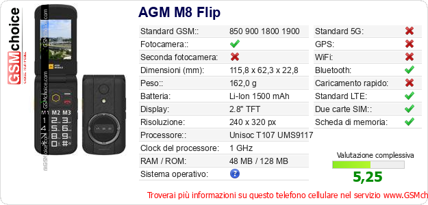 Dati del telefono cellulare AGM M8 Flip sul tuo sito
