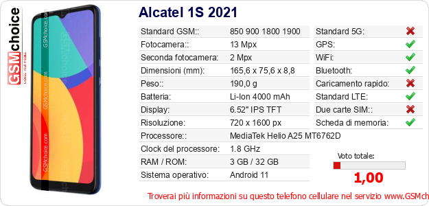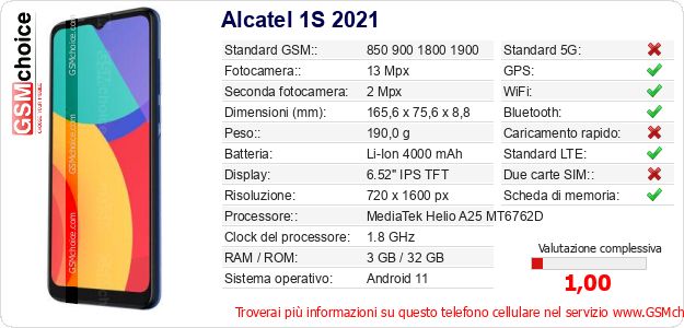 Dati del telefono cellulare Alcatel 1S 2021 sul tuo sito