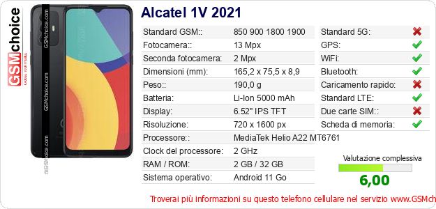 Dati del telefono cellulare Alcatel 1V 2021 sul tuo sito