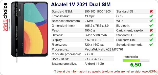 Dati del telefono cellulare Alcatel 1V 2021 Dual SIM sul tuo sito