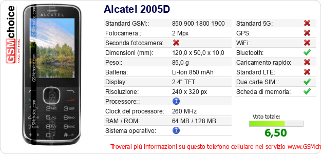 Dati del telefono cellulare Alcatel 2005D sul tuo sito