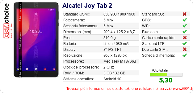 Dati del telefono cellulare Alcatel Joy Tab 2 sul tuo sito