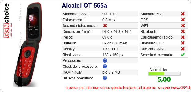 Dati del telefono cellulare Alcatel OT 565a sul tuo sito