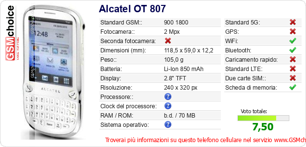Dati del telefono cellulare Alcatel OT 807 sul tuo sito