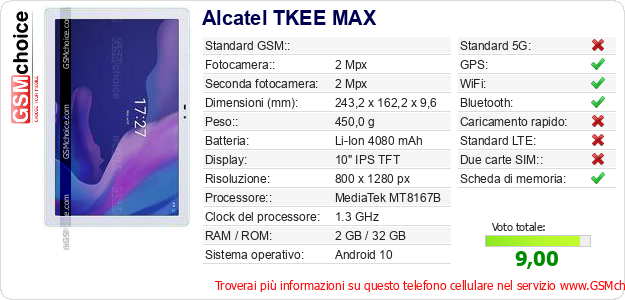 Dati del telefono cellulare Alcatel TKEE MAX sul tuo sito