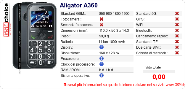 Dati del telefono cellulare Aligator A360 sul tuo sito