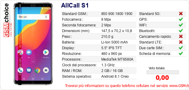 Dati del telefono cellulare AllCall S1 sul tuo sito