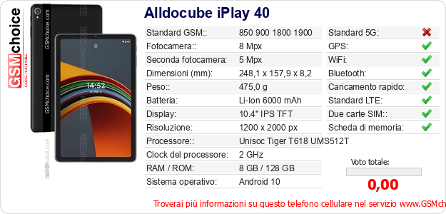 Dati del telefono cellulare Alldocube iPlay 40 sul tuo sito