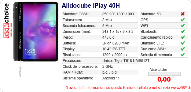 Dati del telefono cellulare Alldocube iPlay 40H sul tuo sito