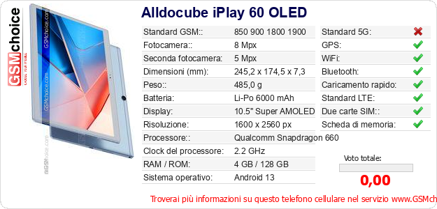 Dati del telefono cellulare Alldocube iPlay 60 OLED sul tuo sito