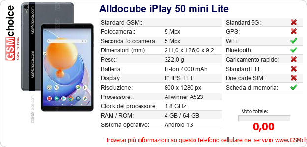 Dati del telefono cellulare Alldocube iPlay 50 mini Lite sul tuo sito