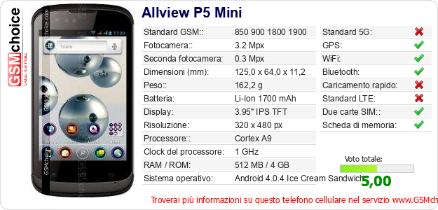 Dati del telefono cellulare Allview P5 Mini sul tuo sito