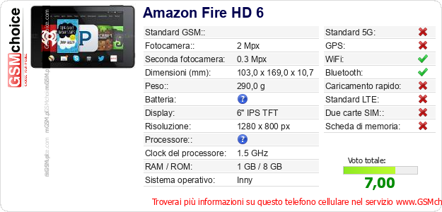 Dati del telefono cellulare Amazon Fire HD 6 sul tuo sito