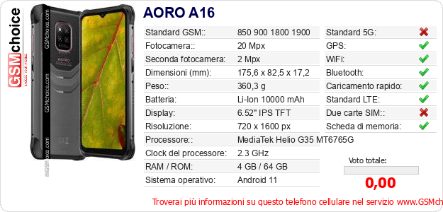 Dati del telefono cellulare AORO A16 sul tuo sito