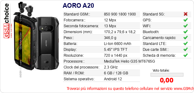 Dati del telefono cellulare AORO A20 sul tuo sito