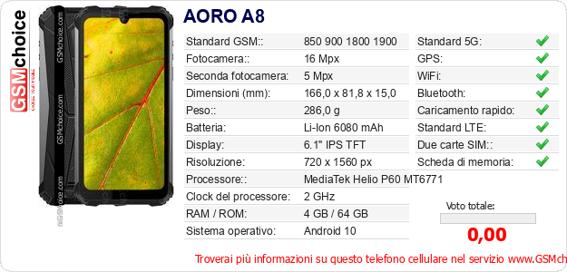 Dati del telefono cellulare AORO A8 sul tuo sito
