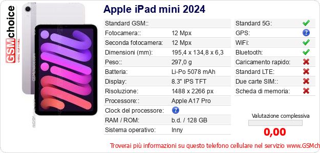 Dati del telefono cellulare Apple iPad mini 2024 sul tuo sito